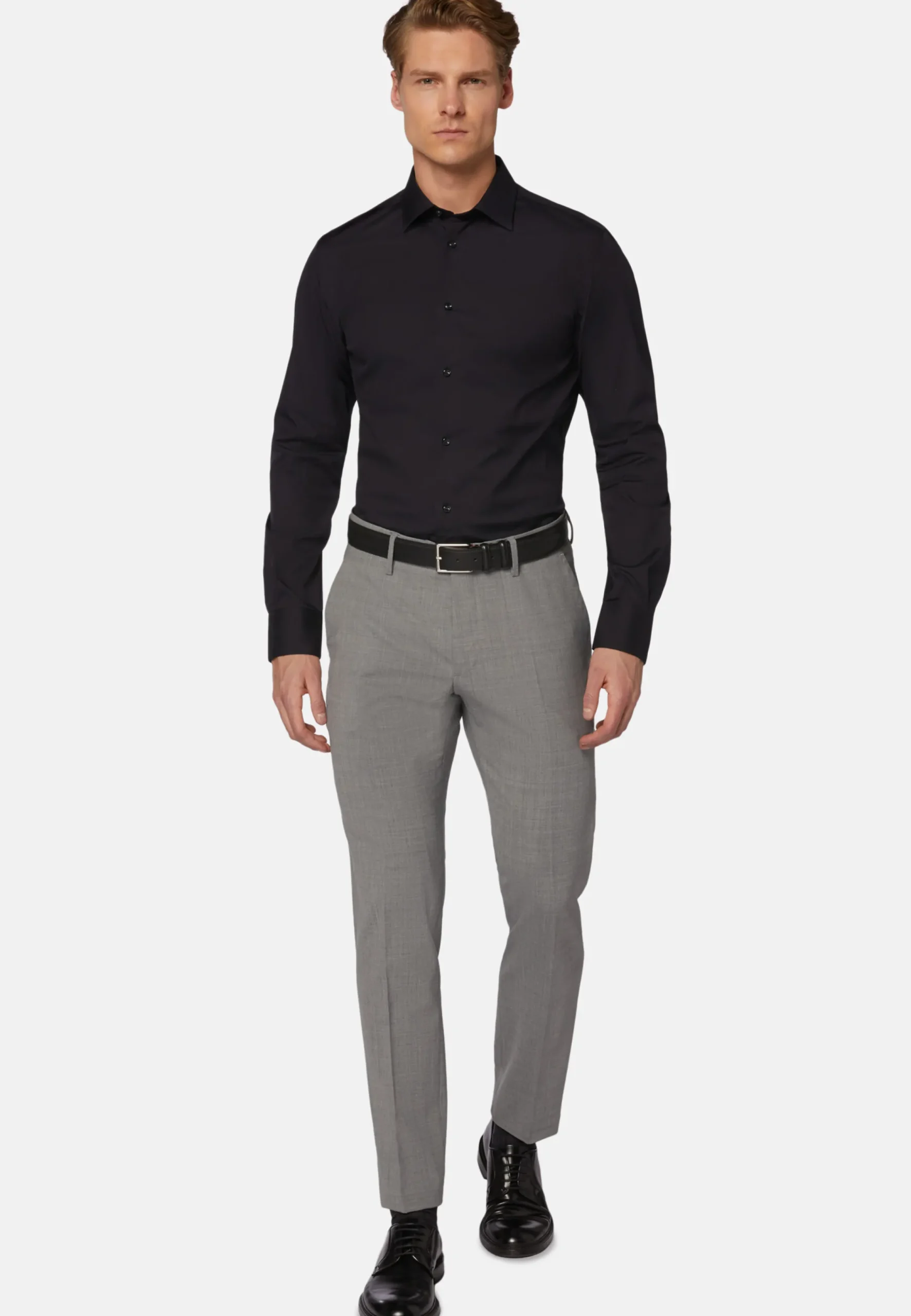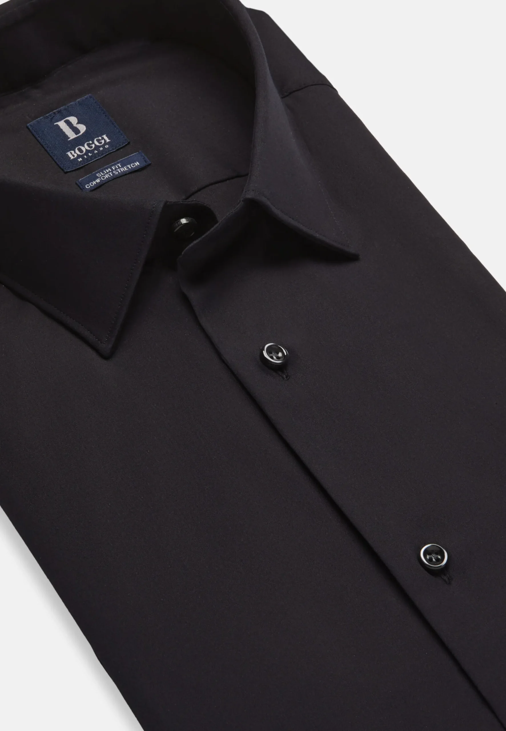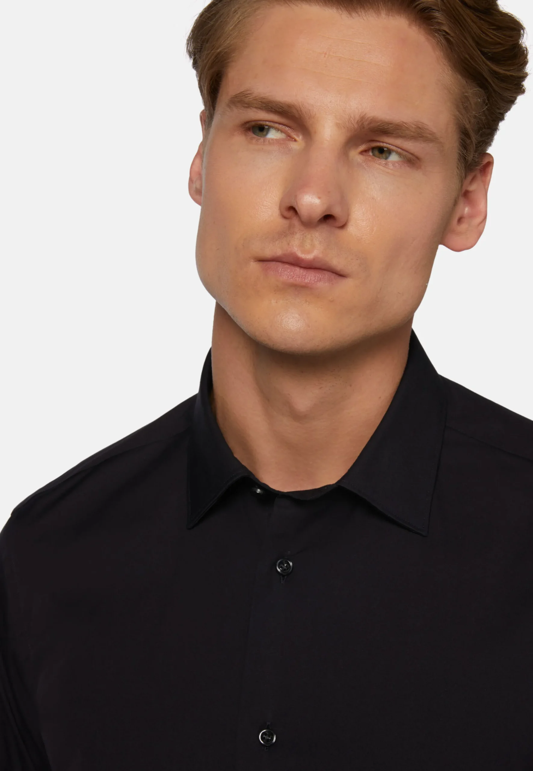 En popeline de coton extensible à double retors fabriquée en Italie.
