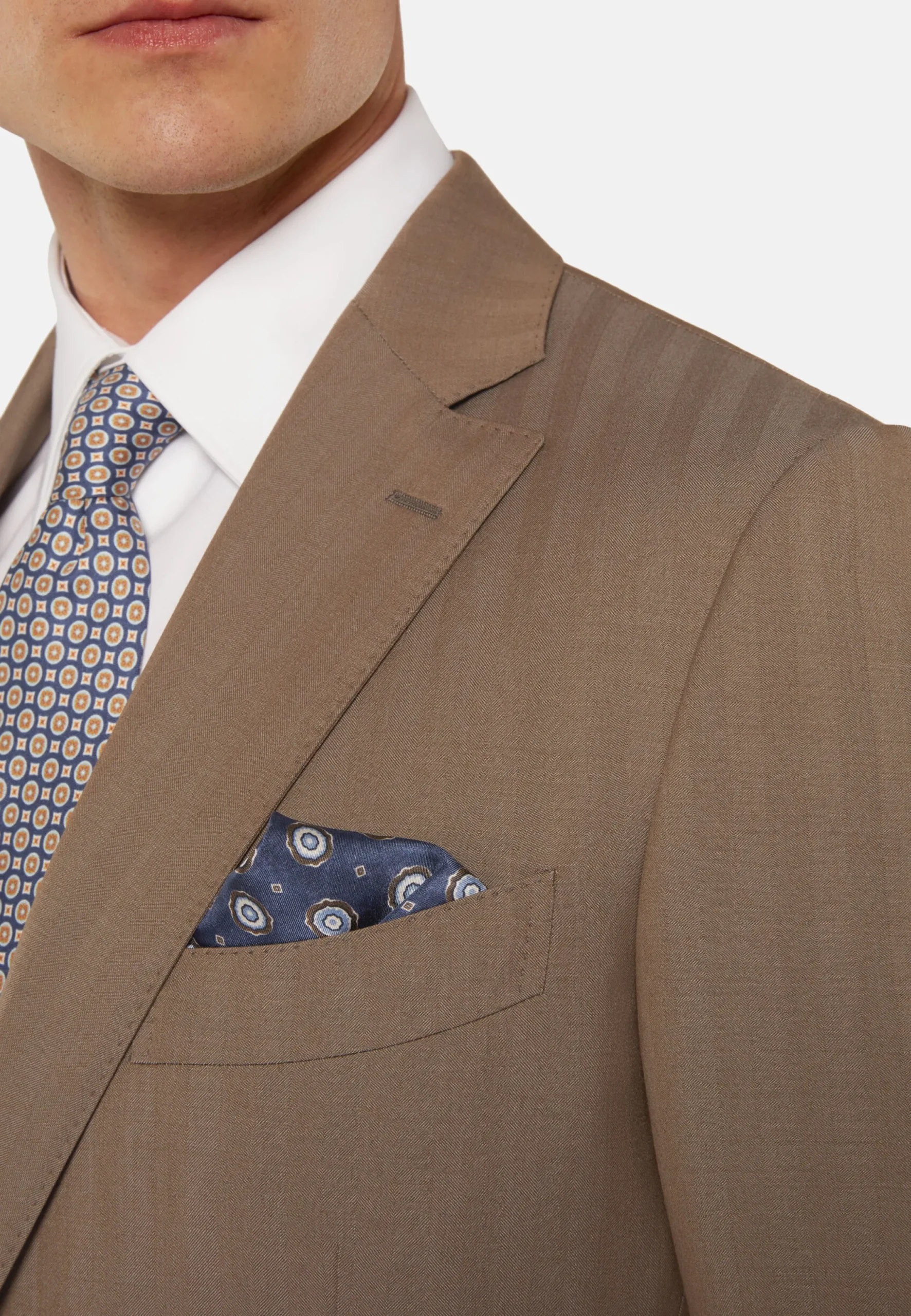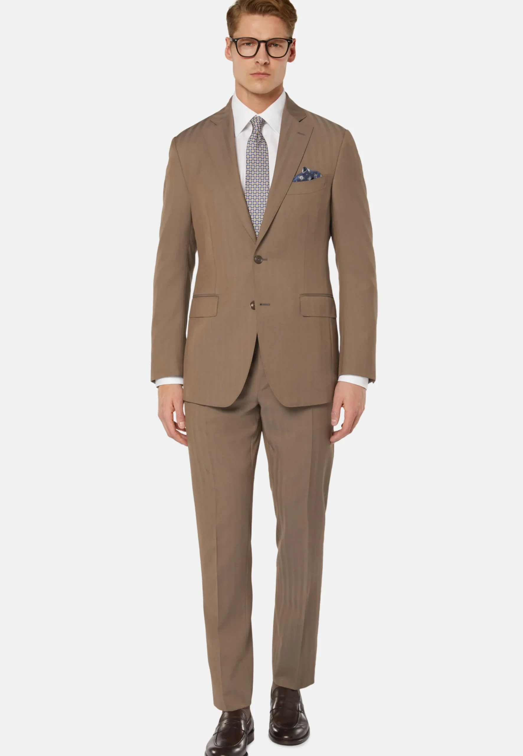 Costume de coupe classique avec construction entoilée, simple boutonnage, entièrement doublé et avec poches à rabat.
