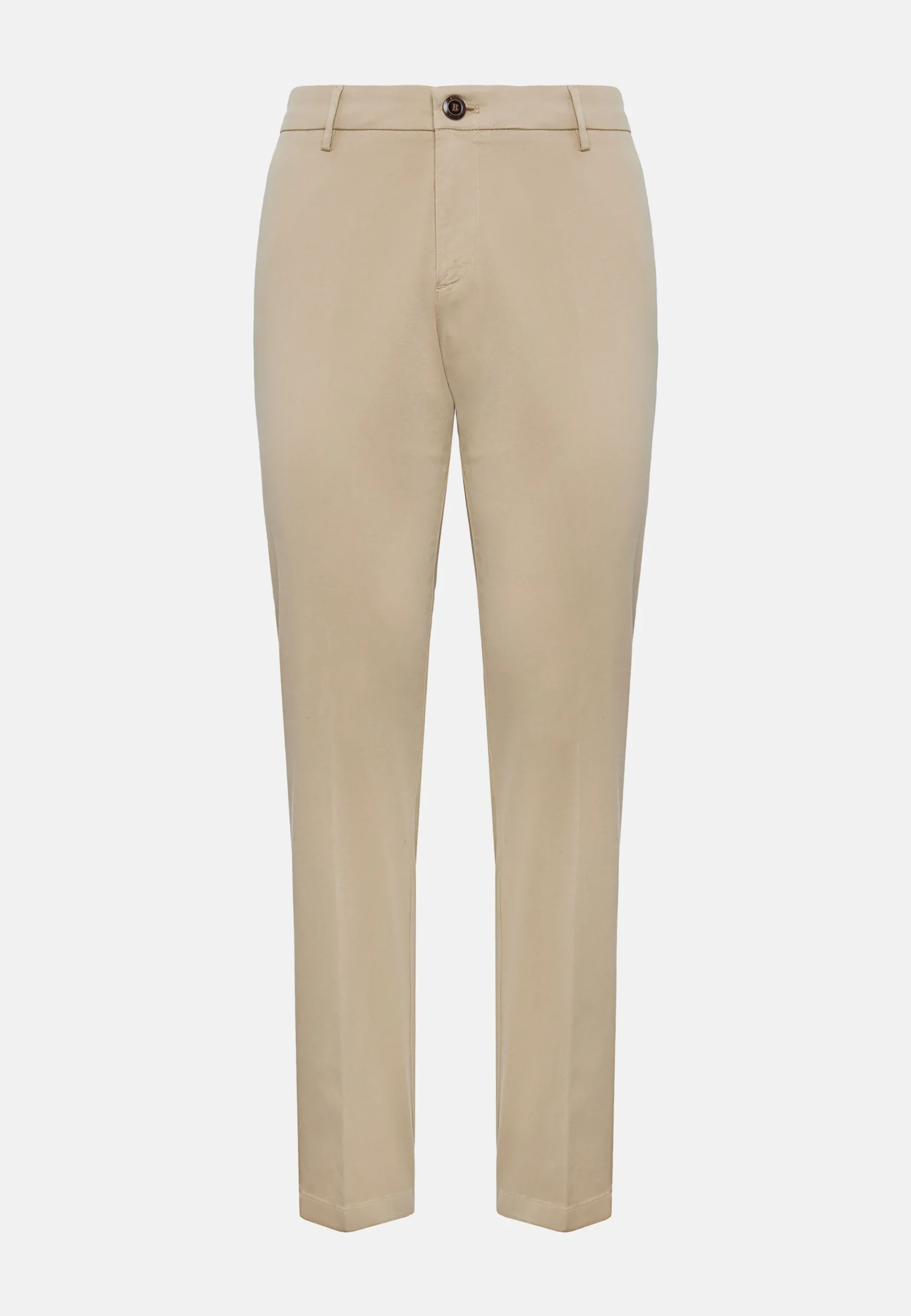 Fermeture avec bouton et zip, poches avant en biais et poches arrière.