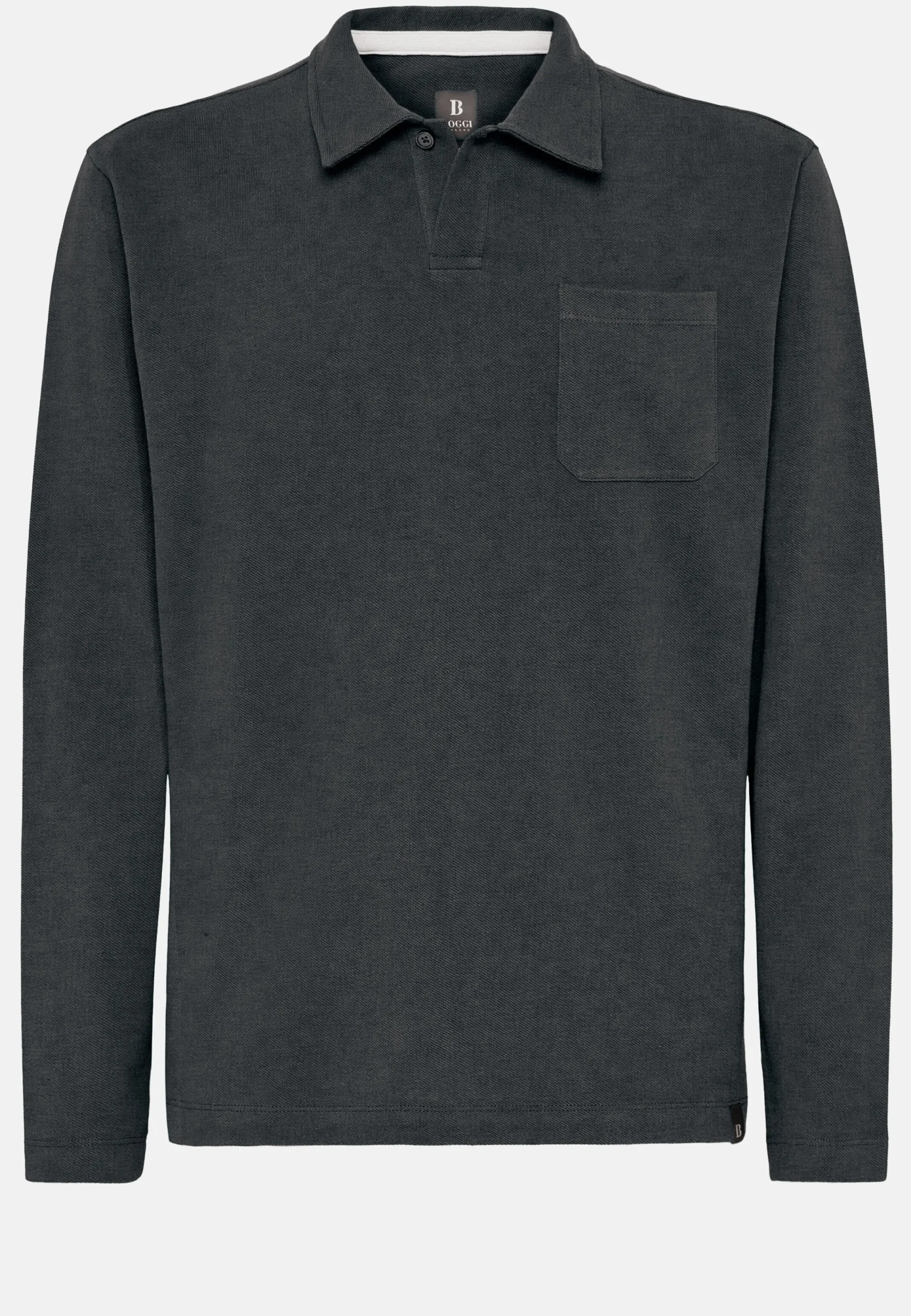 Le modèle présente un col ouvert avec bouton, une poche plaquée sur la poitrine, un ruban de propreté de couleur contrastée à l’intérieur du col et le B de Boggi sur le bas gauche du vêtement.