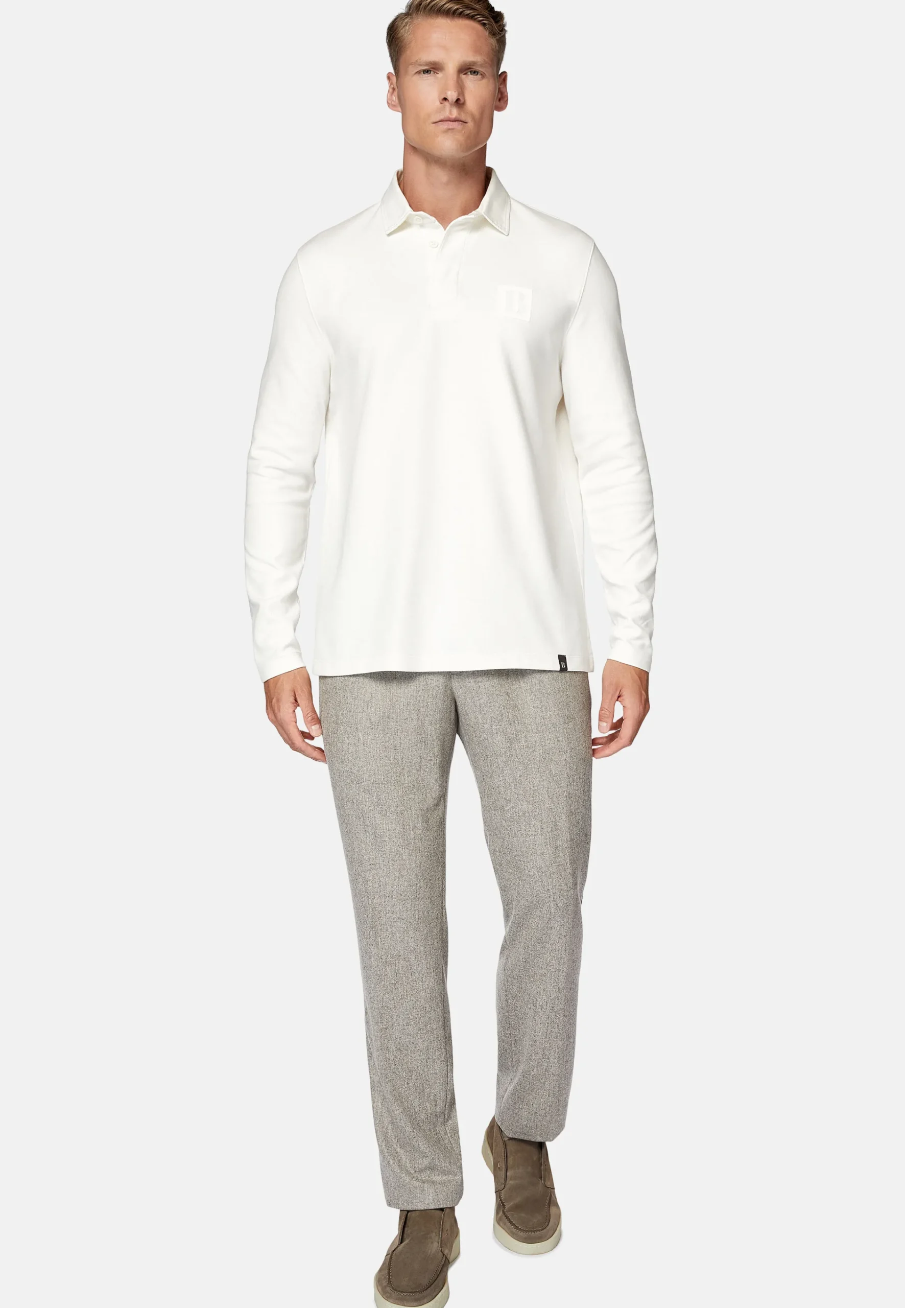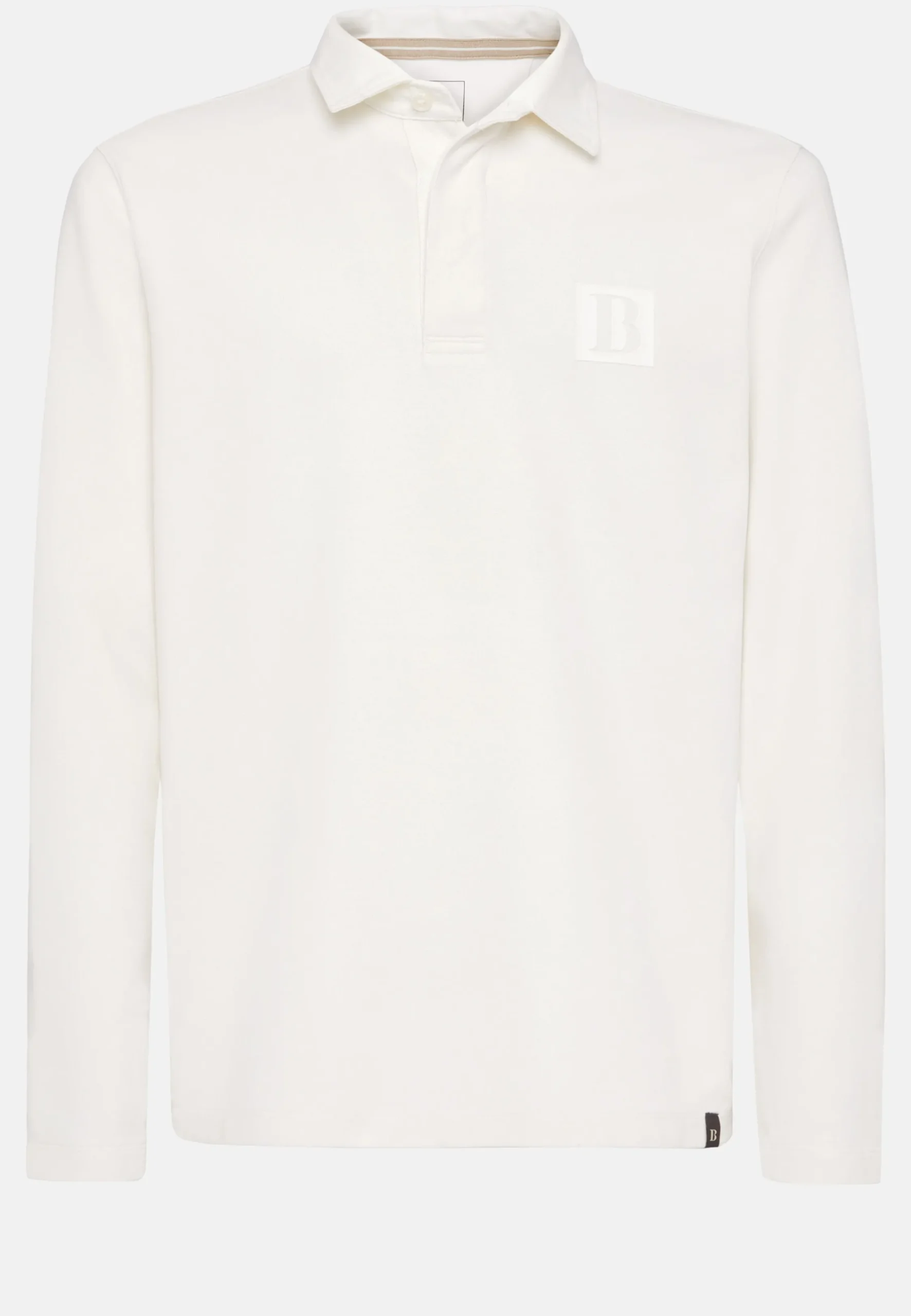Ce modèle de polo présente un boutonnage à l’avant avec boutons au logo dans un tissu avec motif à chevrons, le logo B de Boggi floqué sur la poitrine, la broderie B Sustainable sur le côté arrière gauche et le B de Boggi appliqué en bas à gauche du vêtement.