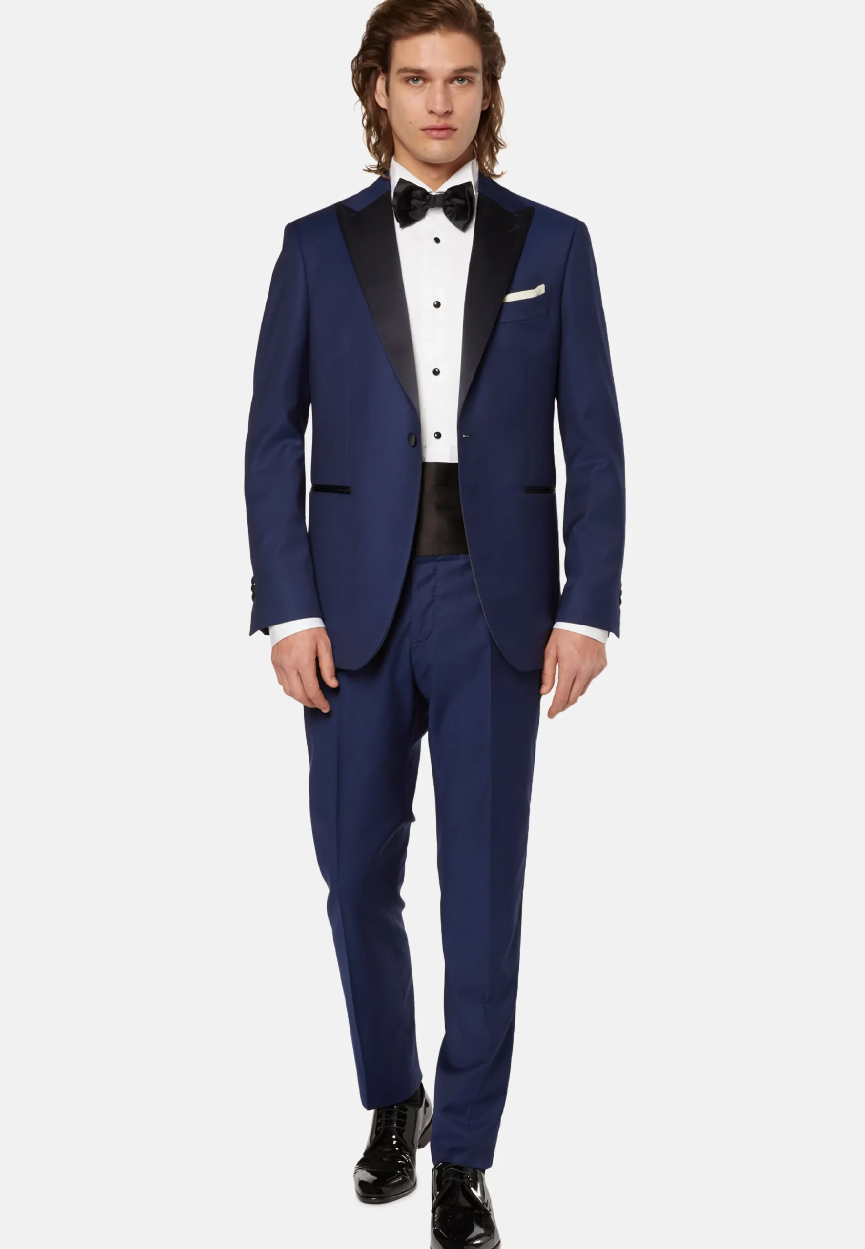 Smoking coupe slim avec construction semi-entoilée, à simple boutonnage, revers en pointe en satin, entièrement doublé avec poches passepoilées.