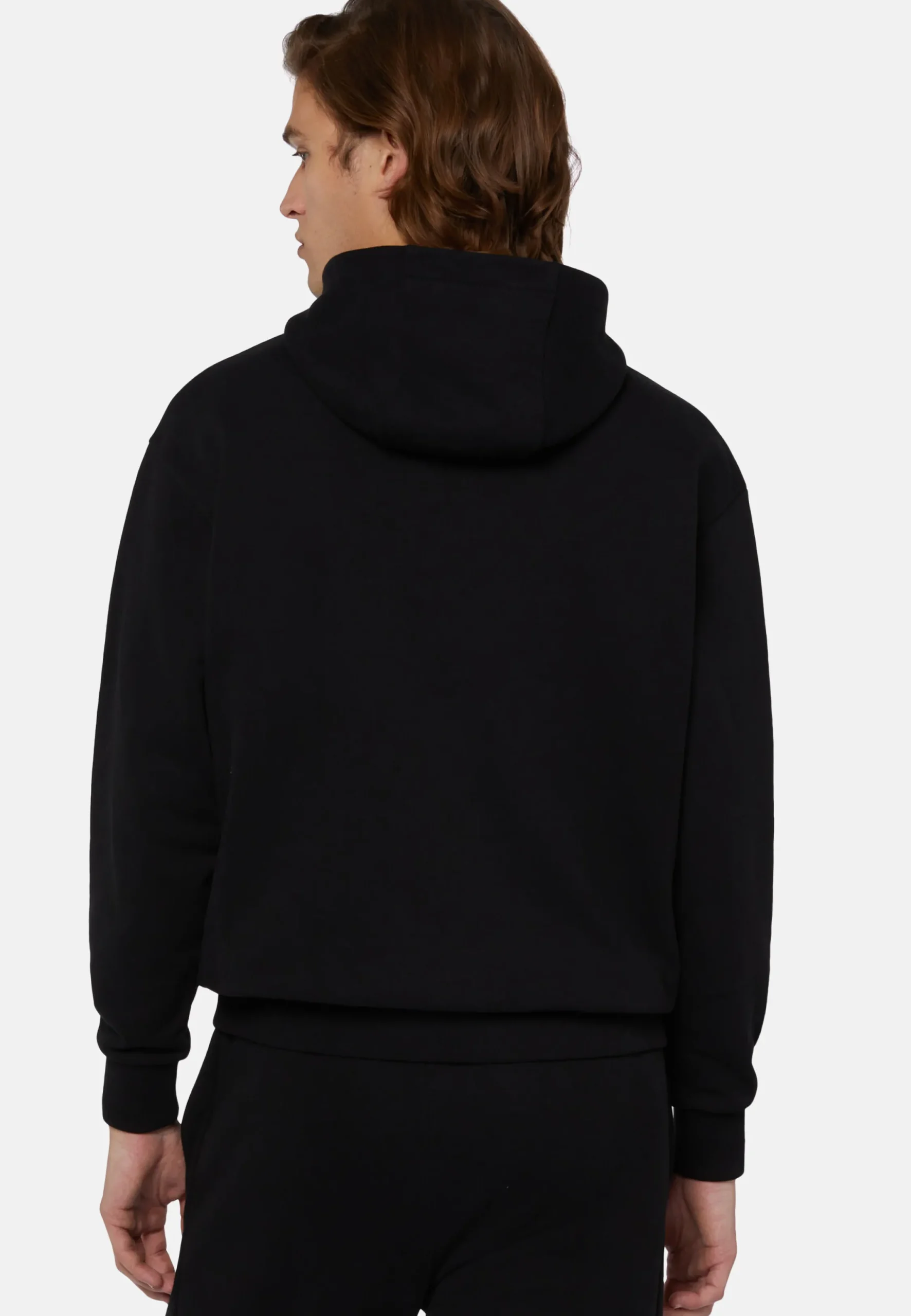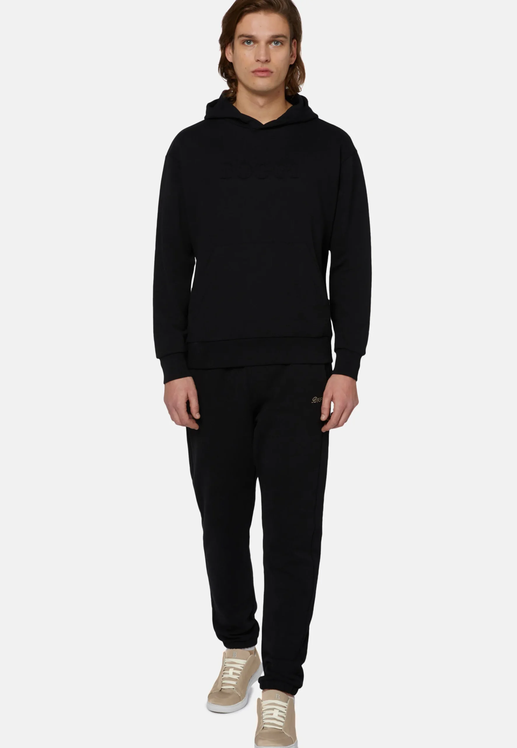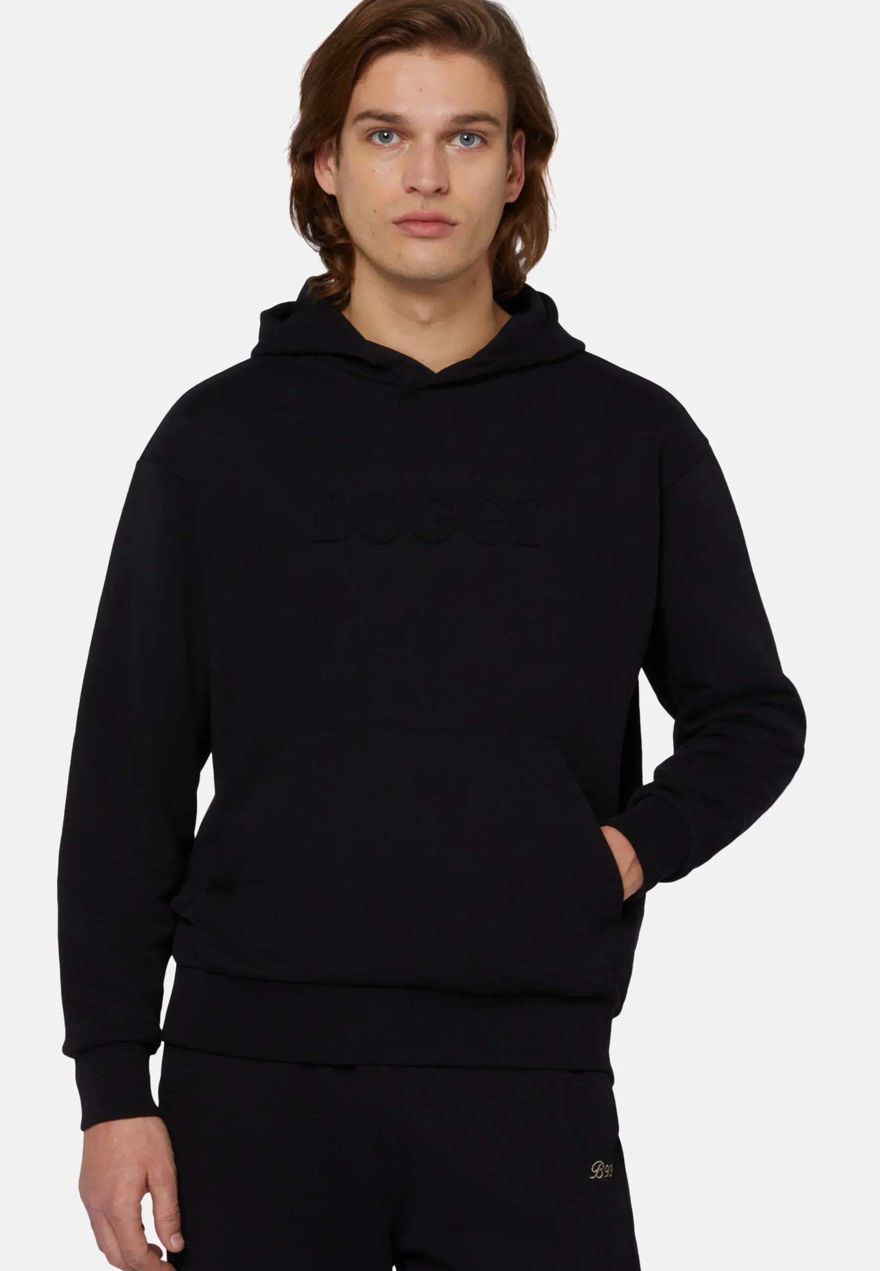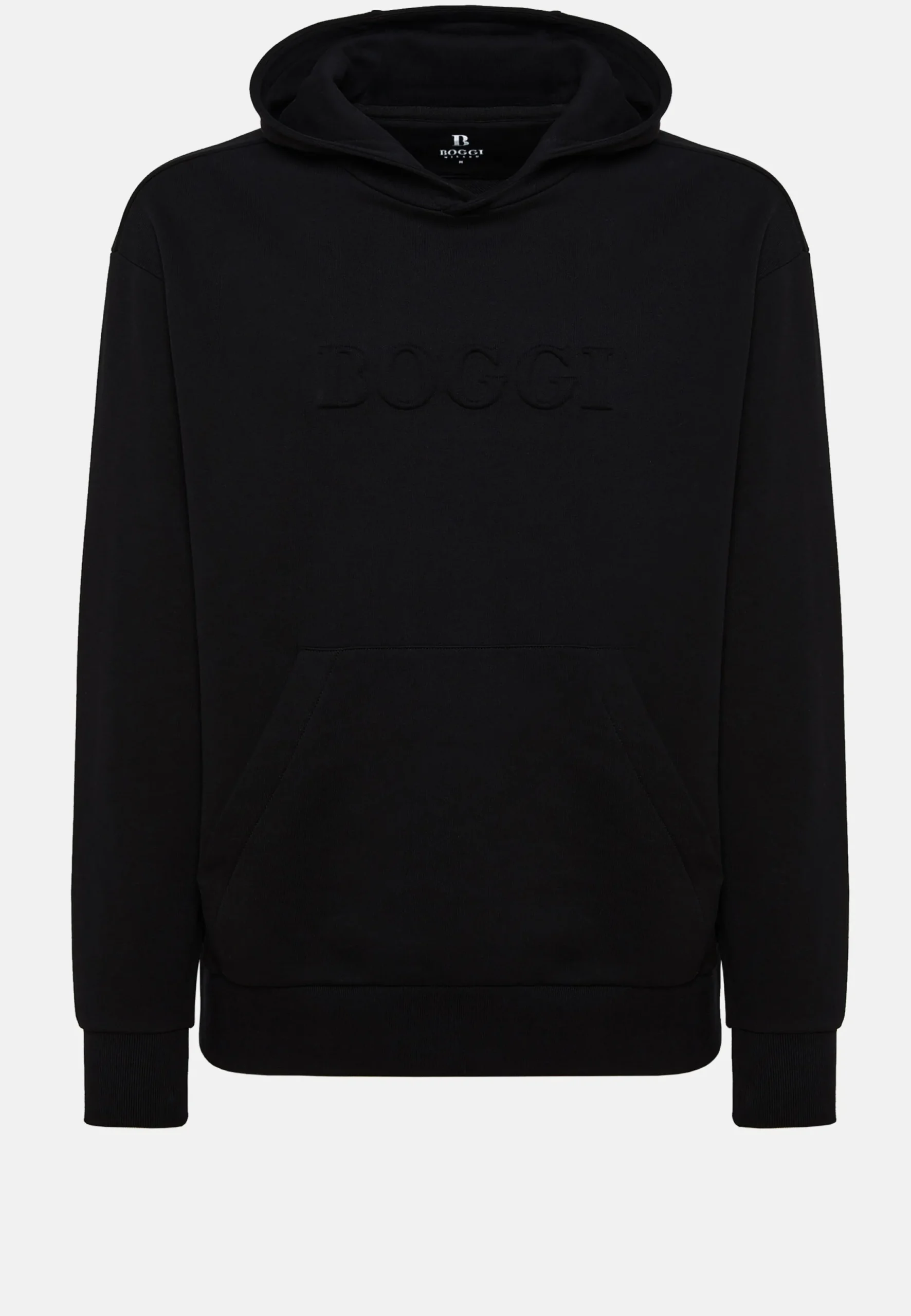 Ce modèle présente une finition en côtes en bas et aux poignets, une poche kangourou et le logo Boggi réalisé en relief sur la poitrine.