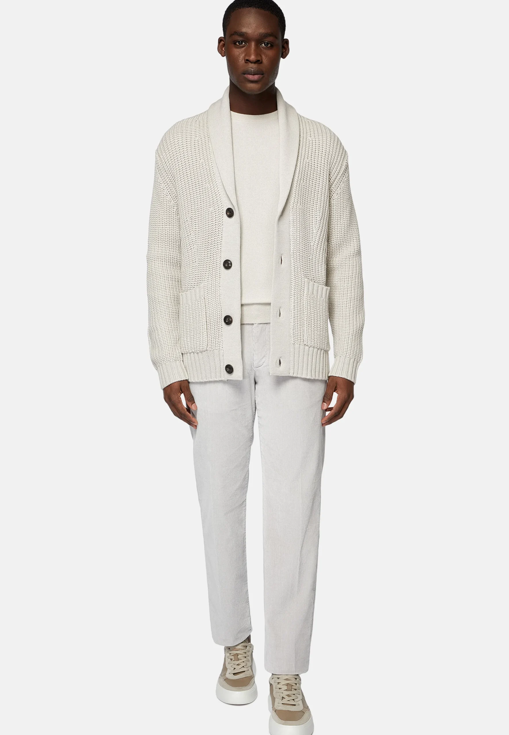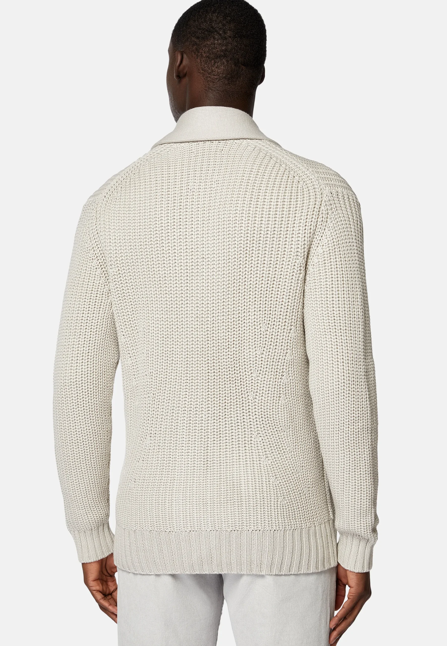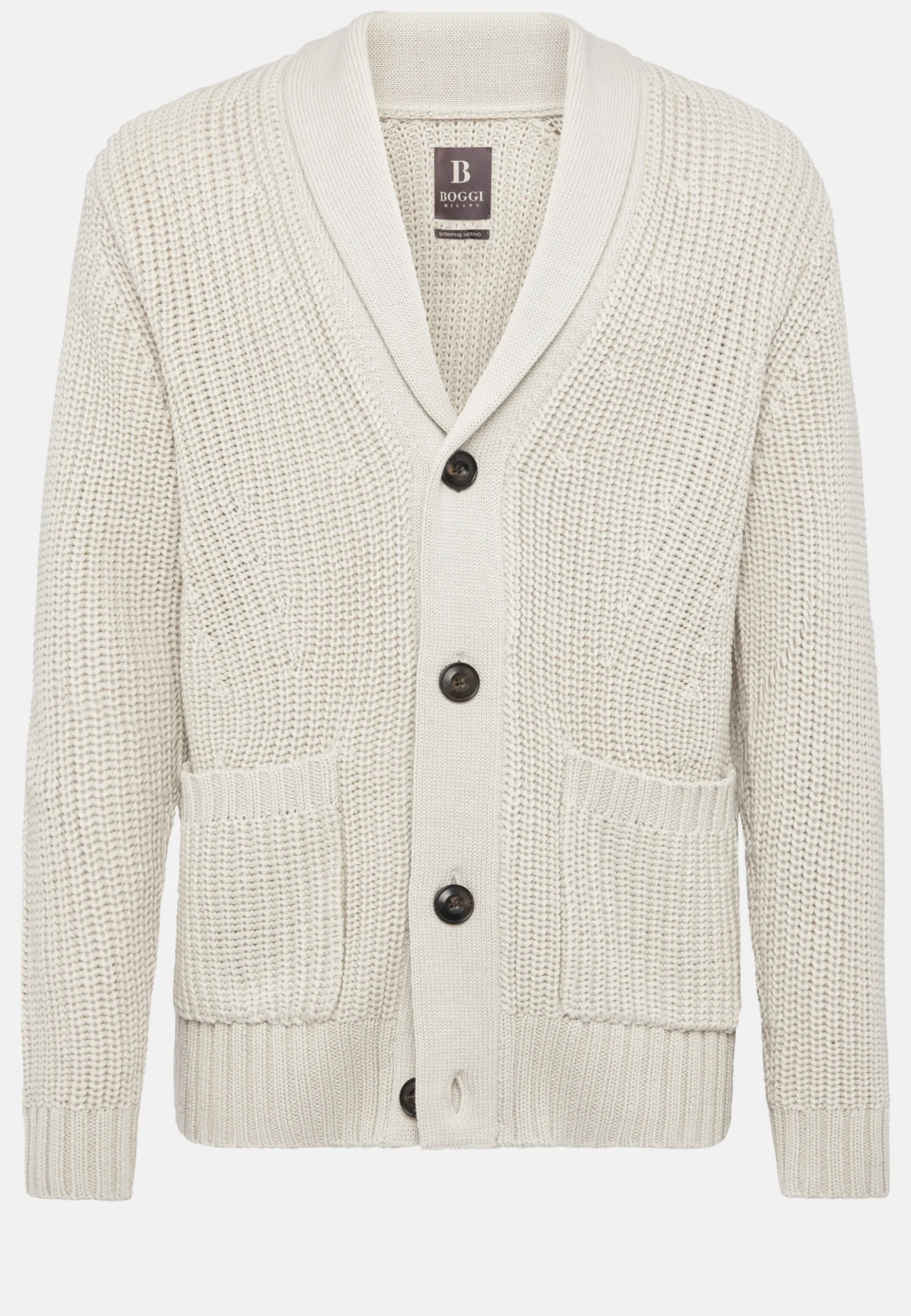 Le vêtement présente une finition en côtes anglaises, des poches avant et des boutons contrastés.