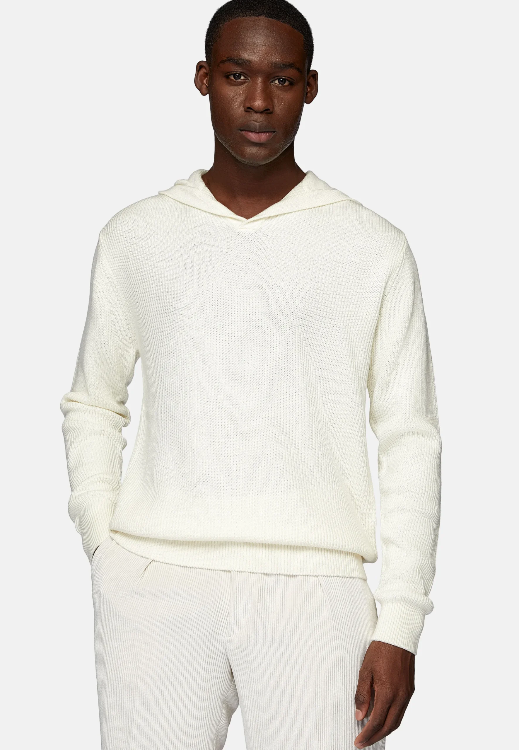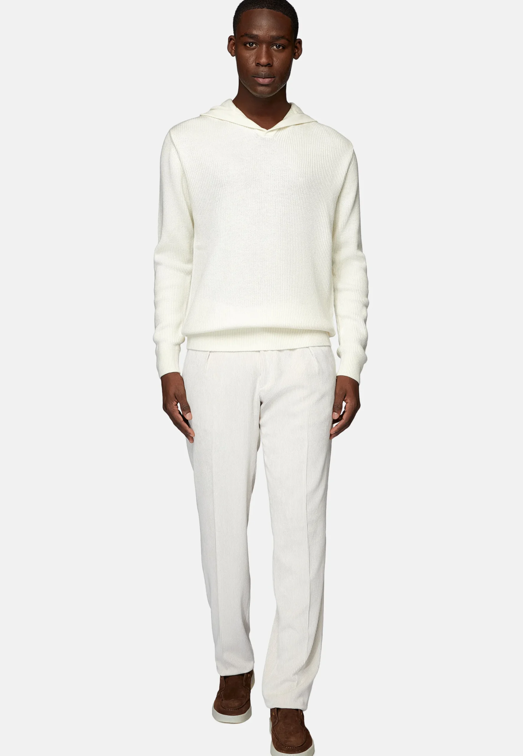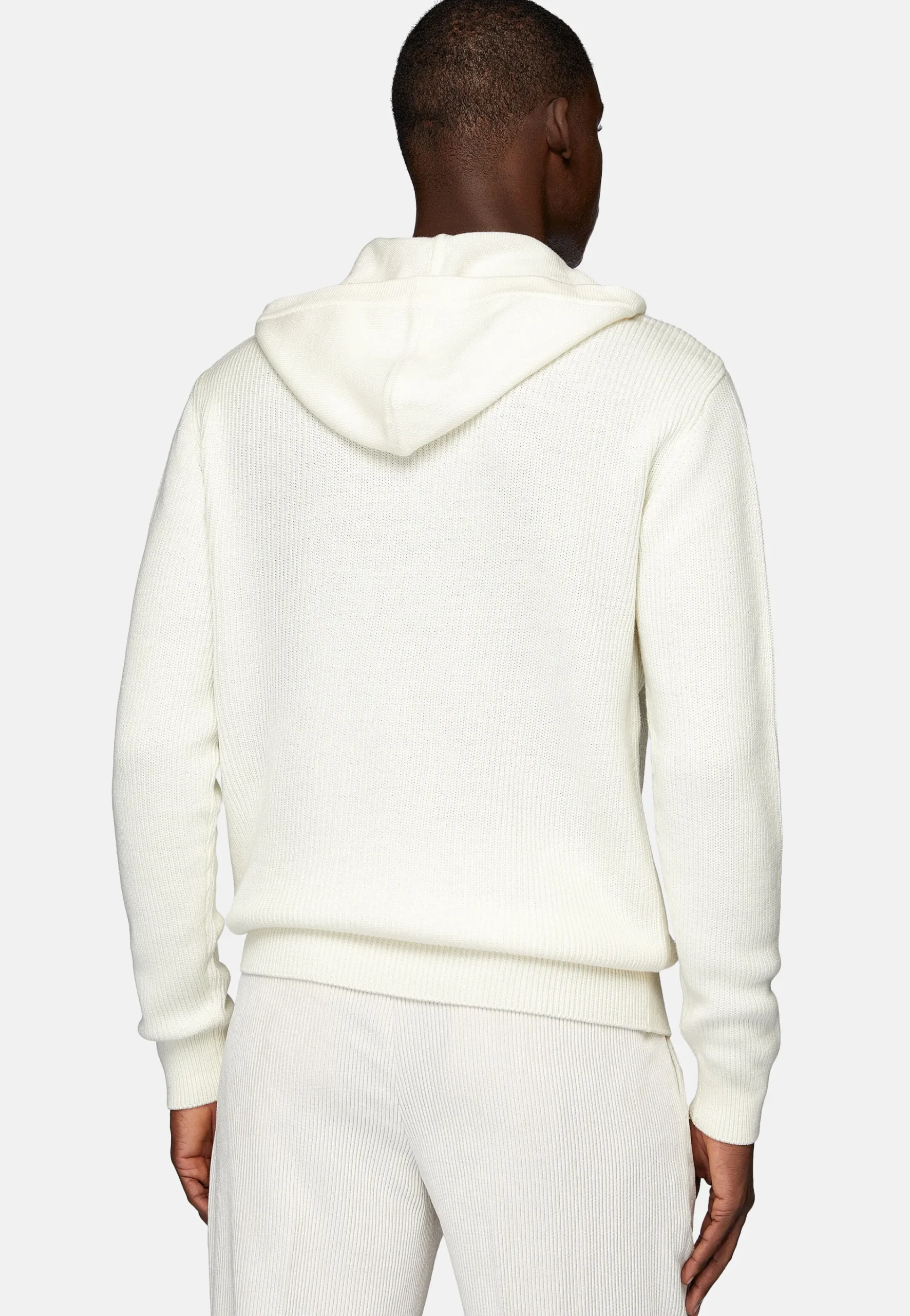 Le vêtement présente des finitions en côtes anglaises.