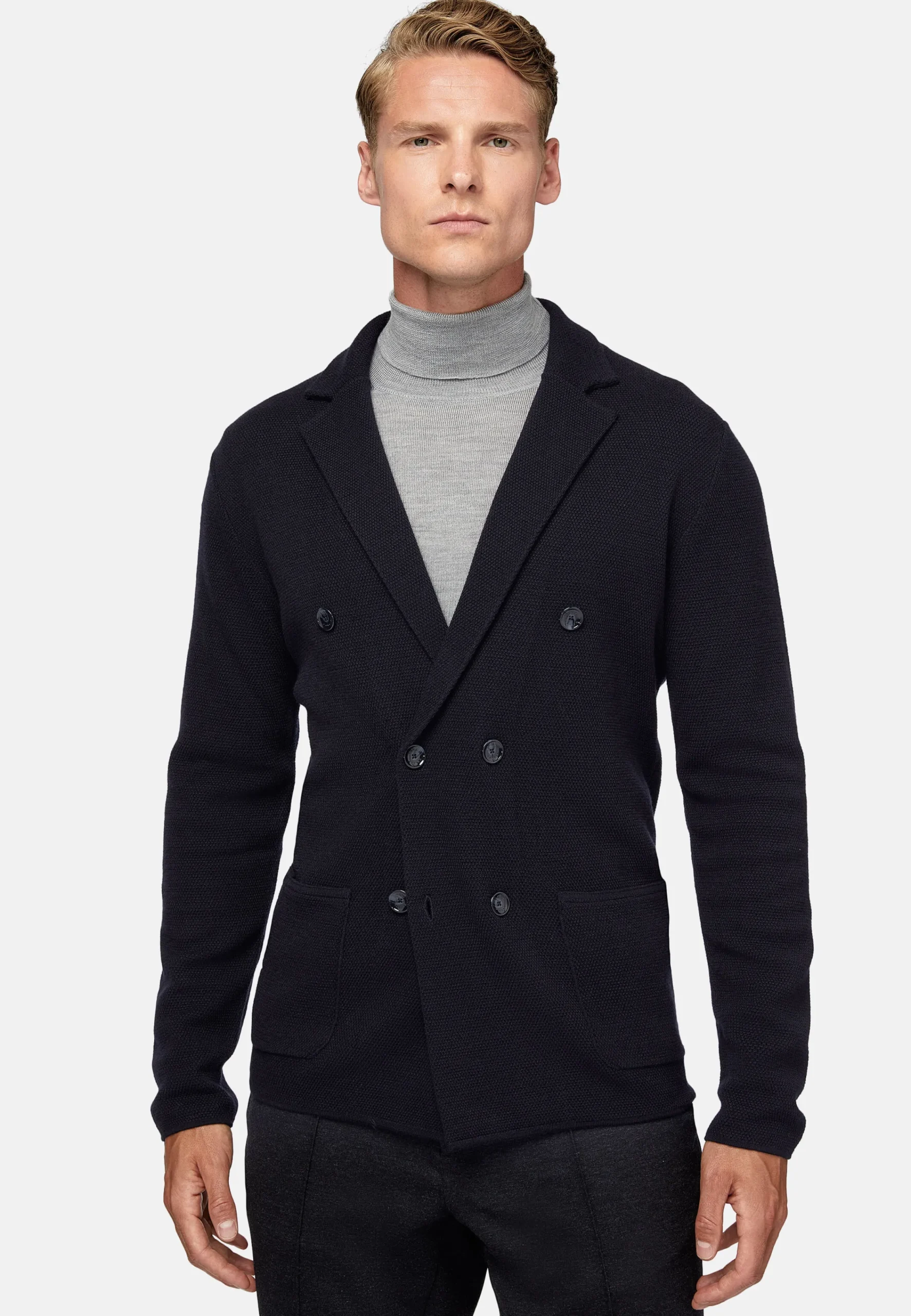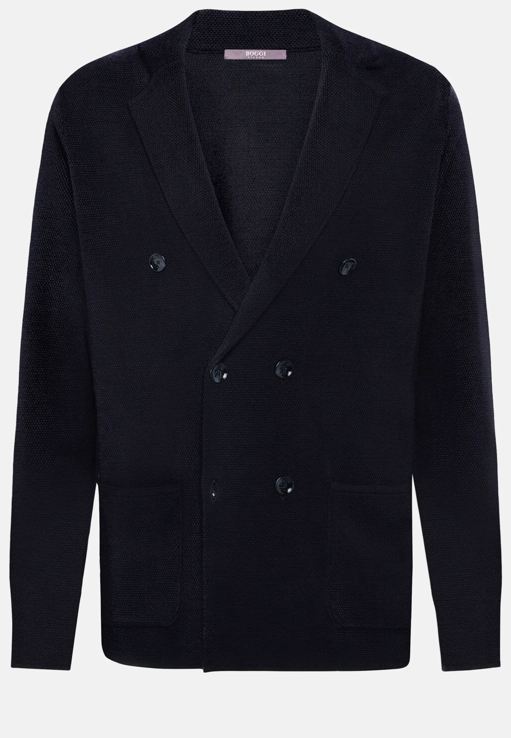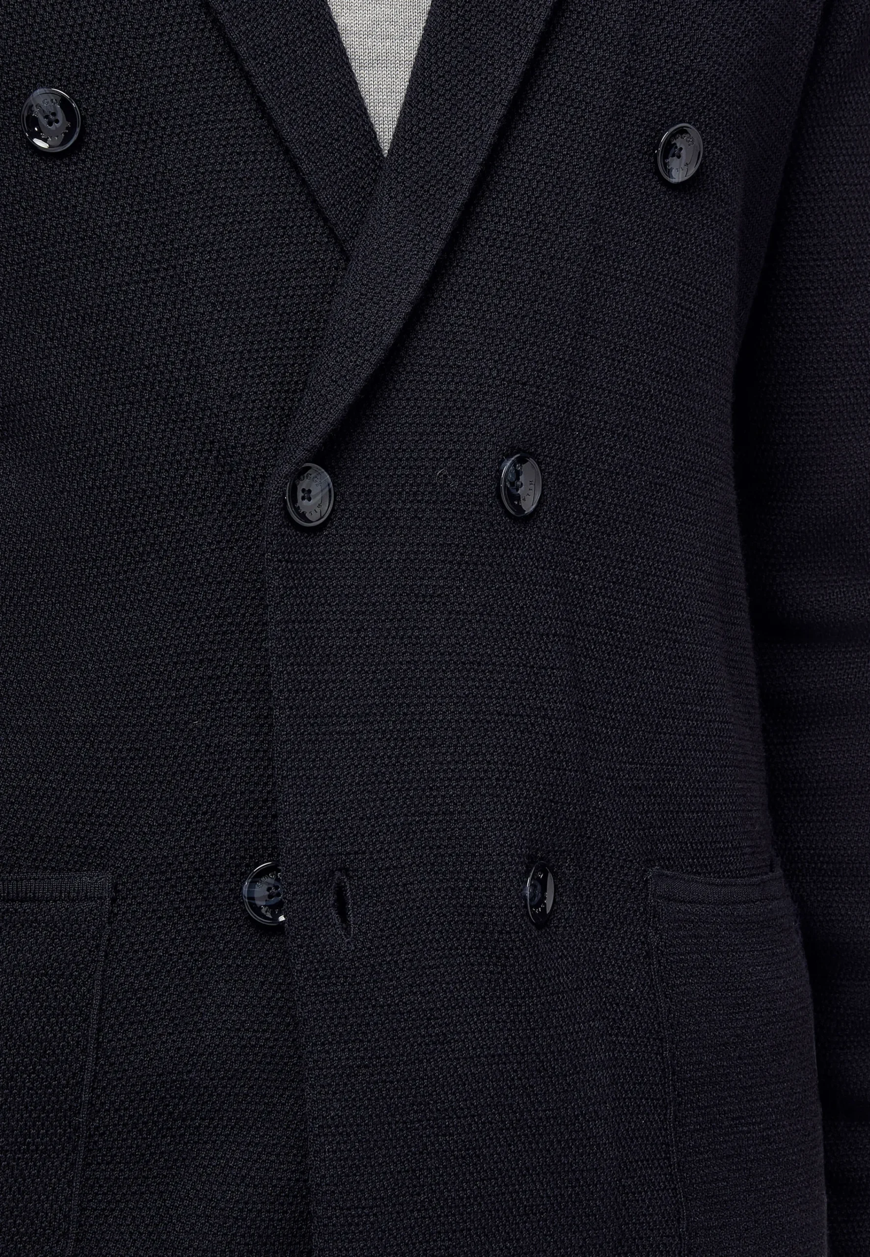 Le vêtement est réalisé au point de riz avec des boutons logotés.