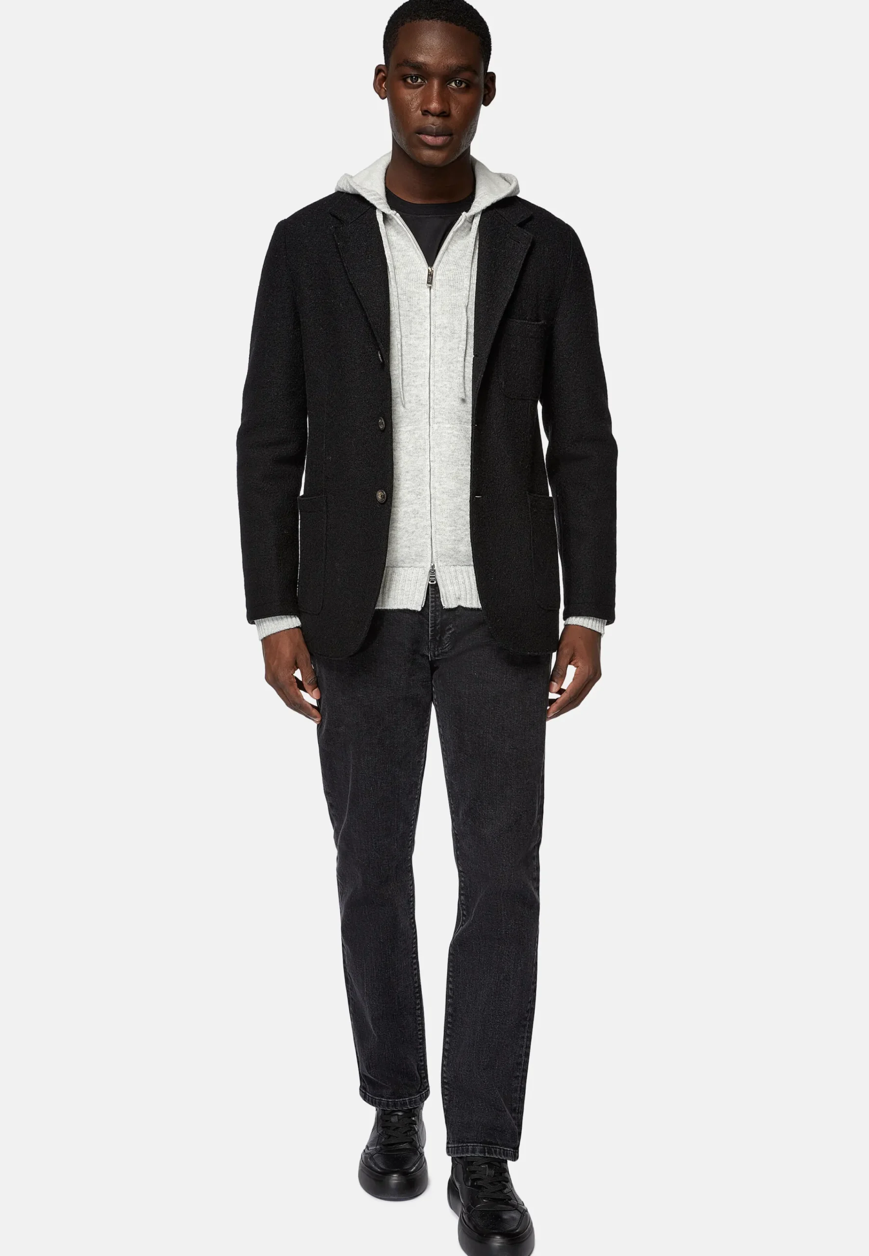 Le vêtement présente une construction particulière avec bords vifs.