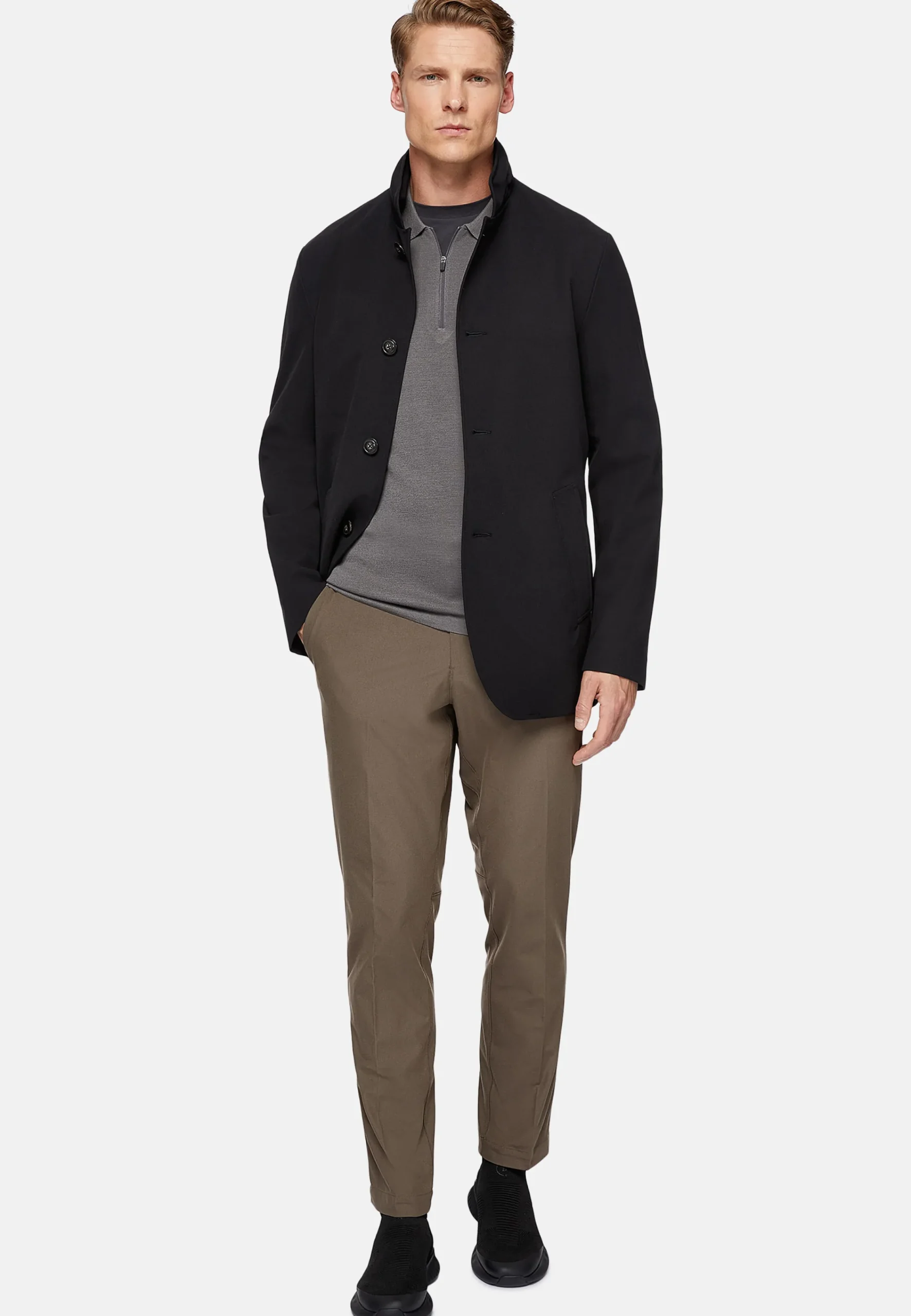 Grâce à l’armure composé de deux fils techniques différents, le vêtement est doté d’un aspect similaire à celui de la laine, avec l’avantage d’être infroissable et déperlant.