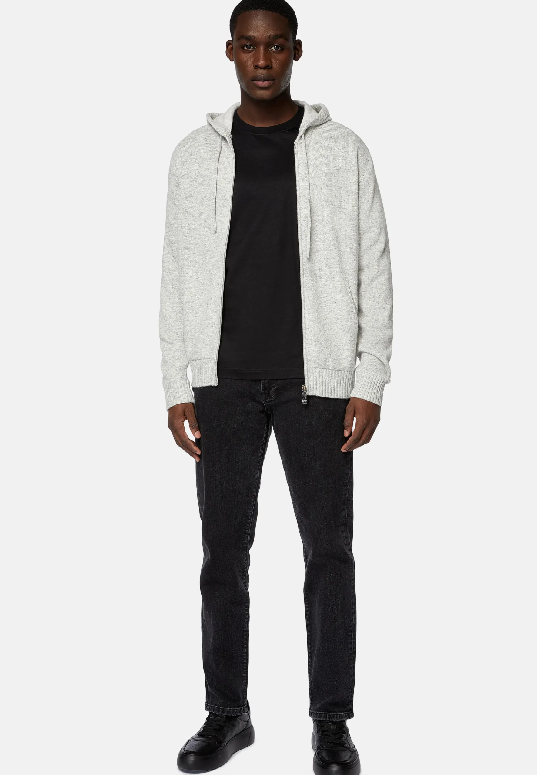 Le vêtement présente un cordon de serrage dans le même ton et des finitions en côtes anglaises vanisées aux poignets et au bas.